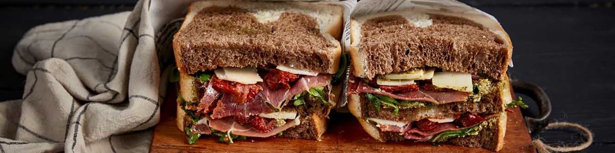 Sur la première tranche de pain de mie, disposer le mélange de salade, les 2 tranches de pastrami, les tomates marinées et les copeaux de parmesan.