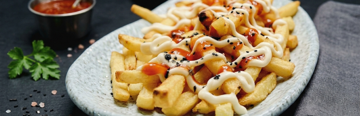 Frites croustillantes préparées au four Mychef, assaisonnées de sel et servies avec mayonnaise et salsa brava. Une solution rapide et efficace pour une offre snacking chaude.