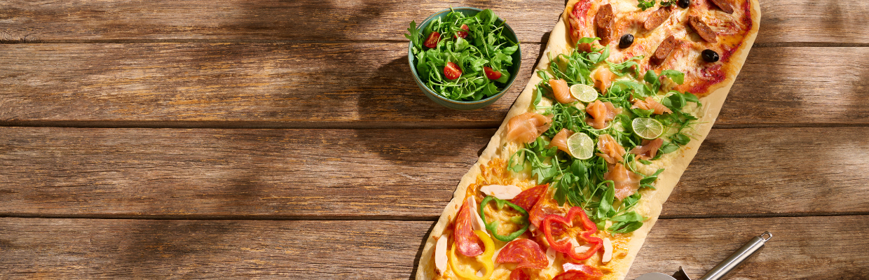 Ajouter les éléments : Saumon fumé de Norvège, Mozzarella râpée, Saint-Môret, Bousin échaloté, roquette et citron vert